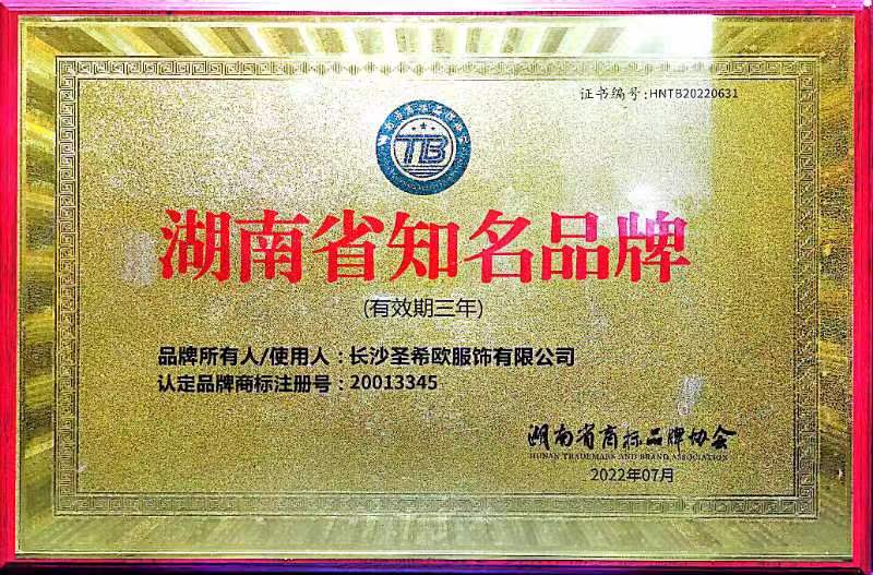 圣希欧服饰荣获“湖南省知名品牌”认定